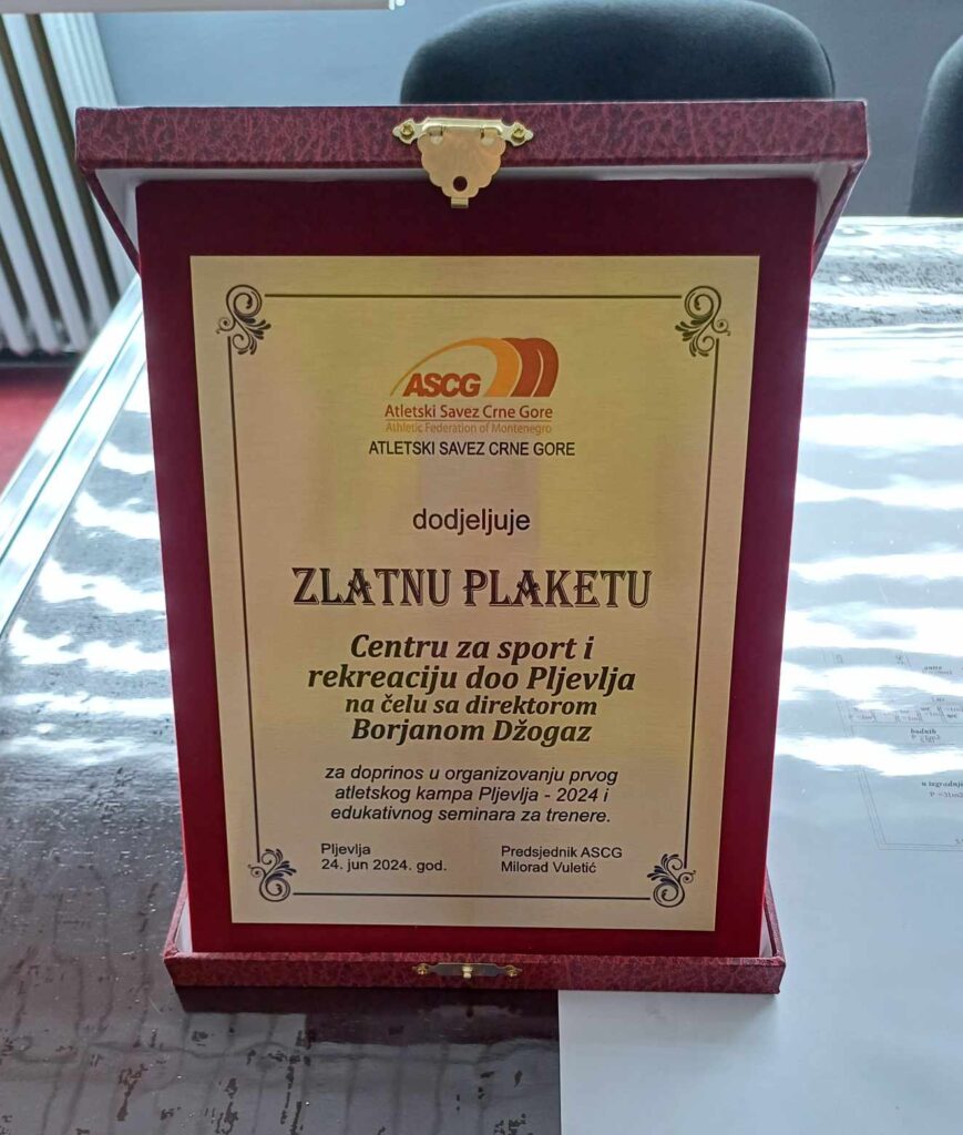 Atletski savez Crne Gore dodjelio je DOO”Centar za sport i rekreaciju”- Pljevlja Zlatnu plaketu za doprinos u organizovanju prvog atletskog kampa Pljevlja-2024 i edukativnog seminara za trenere